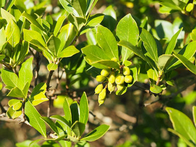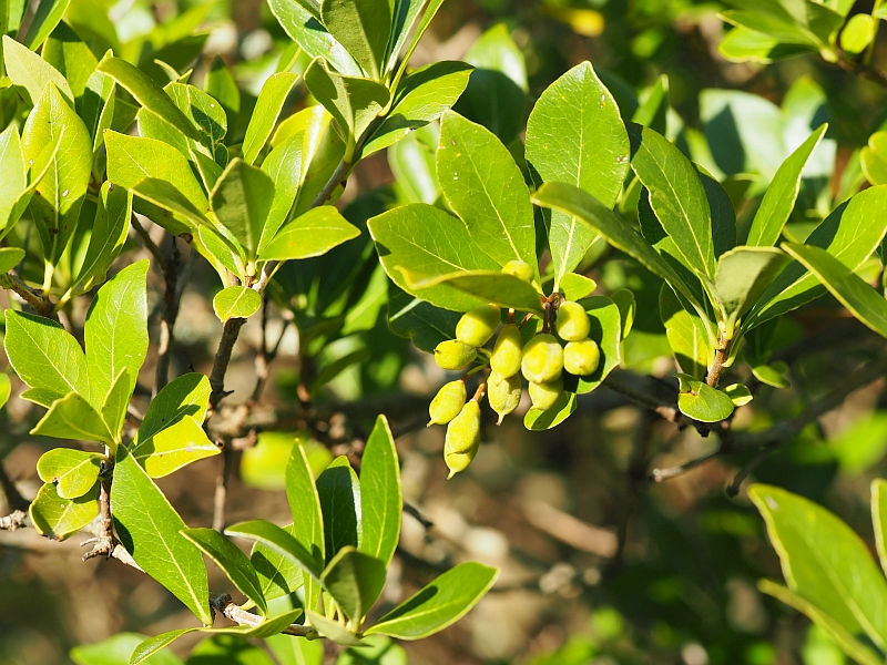I found that the tobira variety was badly damaged in the harsh ‘Beast from the East’ winter and had to be cut to the ground from whence it has slowly recovered. More resilient was the variety Pittosporum heterophyllum which showed no signs of suffering. This variety has similar growth habits but slightly lighter coloured leaves. The flowers in spring are a more yellow shaded and hence less visible, and in winter the fruits are green turning to brown.