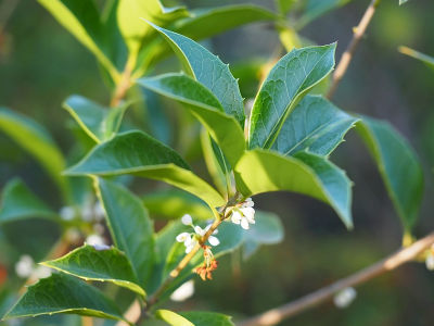 Osmanthus is a family of evergreen shrubs native to East Asia, many of which have small fragrant flowers in late summer or autumn. The species Osmanthus aquifolium (also referred to as O. heterophyllus) is particularly useful for hedging as it has spiky ‘holly’ leaves. The plant grows fairly slowly and does not need much pruning - just a trim of straggly branches in spring to keep it a dense shrub of around 1.5 to 2 metres height.