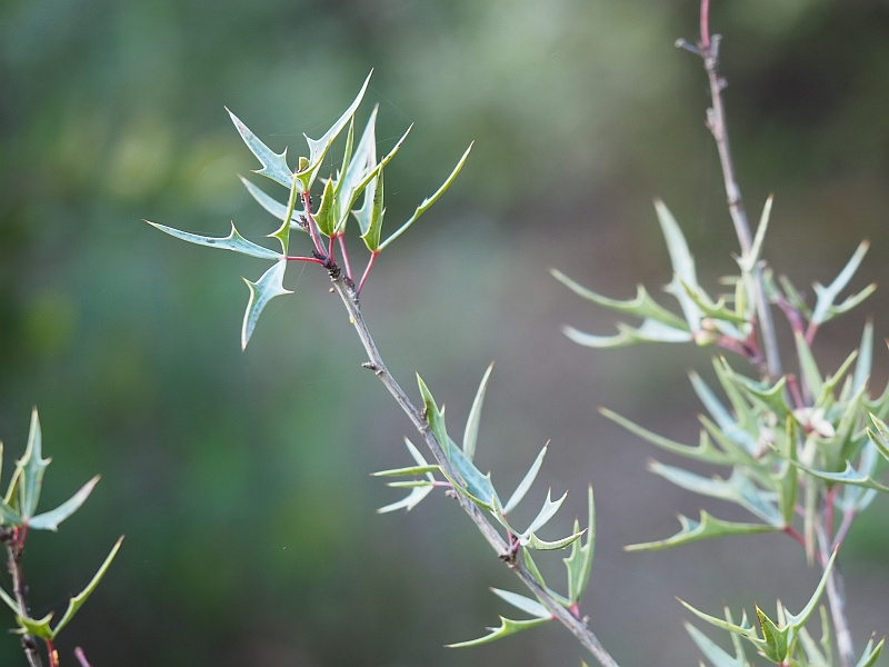 Less brightly coloured but more aggressive in its spines, Mahonia trifoliolata (Chaparral berry) originates from southwest America and is virtually unstoppable in dry climates. It is an effective shrub for defensive hedges but be careful not to let it run wild. This Mahonia has tiny red-yellow flowers and is supposed to have small berries but not (yet) in my garden.