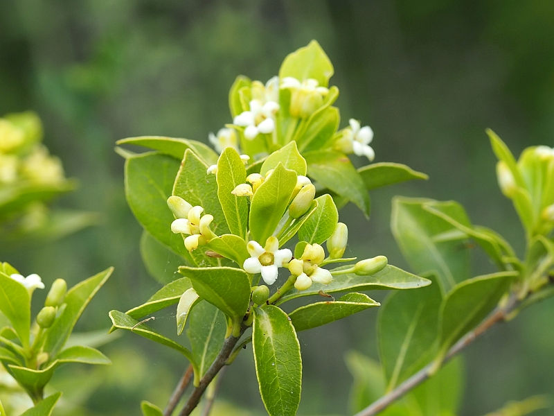I found that the tobira variety was badly damaged in the harsh ‘Beast from the East’ winter and had to be cut to the ground from whence it has slowly recovered. More resilient was the variety Pittosporum heterophyllum which showed no signs of suffering. This variety has similar growth habits but slightly lighter coloured leaves. The flowers in spring are a more yellow shaded and hence less visible, and in winter the fruits are green turning to brown.
