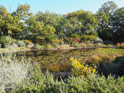 Attention then turned to the other side of the pond where the steep bank had become choked with overgrown Teucrium fruticans and Cistus salviifolius with most of the lavender having become too woody to save. Inevitably this left gaps – or as my gardening friends call them ‘opportunities’ - to fill. I selected two varieties of Perovskia atriplicifolia: 'Blue Spire' which grows to around 1m tall and ‘Little Spire’ which a bit shorter as the name suggests. Other gaps were filled with groups of Cistus x skanbergii and Caryopteris x clandonensis 'Kew Blue' as well as refreshed areas of lavender (Lavandula x intermedia 'Grosso').