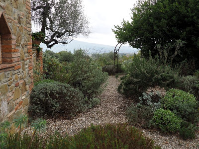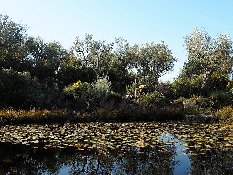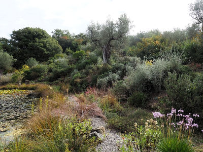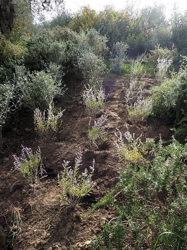 We also took the opportunity to replant the area under the olive tree at the far end of the pond. Here the wild boar had dug up and eaten every single one of the (very many) Iris germanica that I had carefully planted there. Replacements included: low growing carpeting plants Ceratostigma griffithi and Teucrium marum; silver plants Artemisia abrotanum 'Silver' and Artemisia arborescens ‘Powis Castle’ interspersed with purple flowered Tulbaghia violacea.