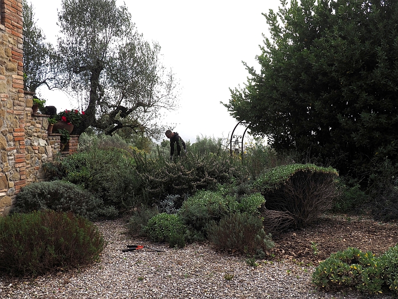 But start they did on the long shrubbery to the left of the pond. Not much actual pruning but more a question of removing dead wood (of which there was lots) and branches that were suffocating their neighbours. The big Teucrium fruticans were thinned out but in spring we (or rather ‘they’) will take all these shrubs almost down to ground level to stimulate denser growth.