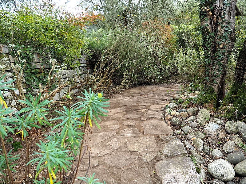 The stairways and paving below the house - one of the first areas I created in the garden - had become very overgrown and the lovely stonework was buried. Ruthless trimming and raking of mounds of leaf litter took a lot of effort, especially where self-seeded shrubs and trees had to be removed with a pickaxe.